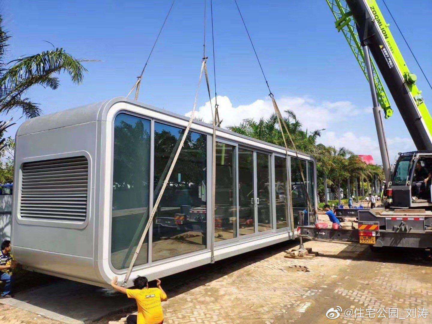 柜族本次參展的產品——逸海小筑位于E2裝配式建筑展區(qū)的2269展位,是一款以藍白為主色調、融入了水與波浪元素的海洋風集裝箱別墅。該產品的設計理念為環(huán)保、舒適、旅居,以不破壞場地與自然環(huán)境為出發(fā)點,整個產品為工廠預制完成,地面抬高3個臺階,有效隔離了地面的潮氣。箱子著力點有圓柱支撐,底座圓盤加大了受力面積和整體平衡性。箱子整體分為一、二層兩個模塊,用吊機和平板車整體裝卸運輸,在選好的平整地面直接擺放就可以入住使用了。